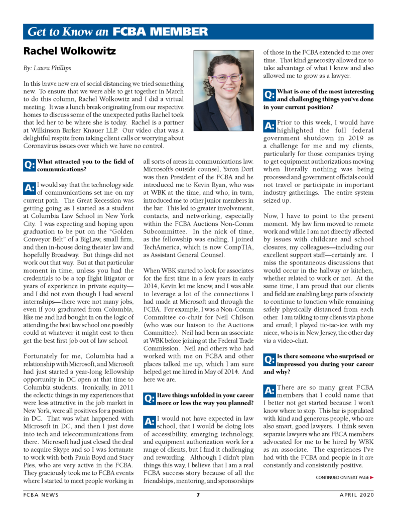 Rachel Wolkowitz Highlighted in April 2020 FCBA Newsletter’s “Get to Know an FCBA Member”